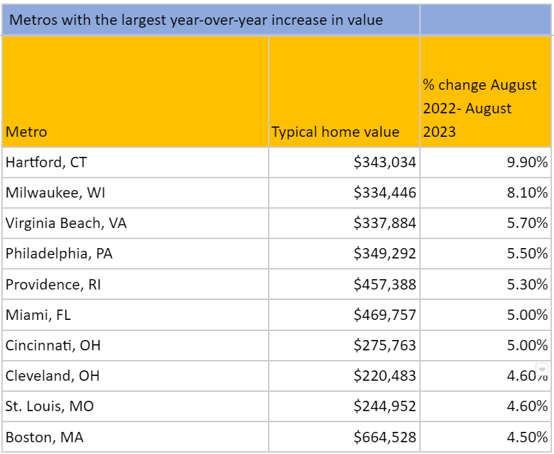 Zillow’s analysis has identified the top 10 housing markets in 2023 based on changes in home prices in the nation’s 50 largest metro areas from August 2022 to August 2023. These metros have seen substantial increases in home values, making them attractive markets for both buyers and sellers. The top 10 housing markets and their respective percentage change in home values are as follows: