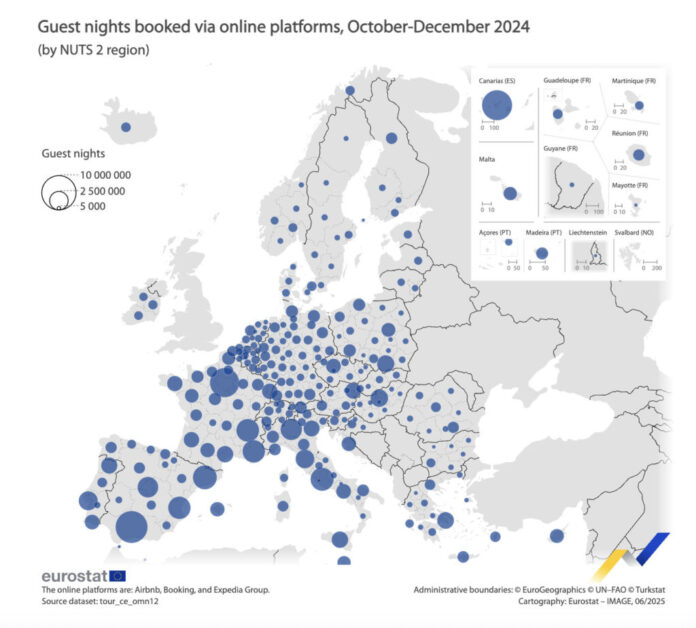 Eurostat map showing Q4 2024 guest nights in EU short-stay rentals, with highest demand in France, Spain, Italy, and key islands.