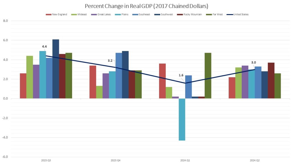 Nationwide, growth in real GDP (measured on a seasonally adjusted annual rate basis) increased 3.0 percent in the second quarter of 2024, which is higher than the first quarter level of 1.6 percent. Nondurable-goods manufacturing; finance and insurance; and health care and social assistance were the leading contributors to the increase in real GDP across the country.