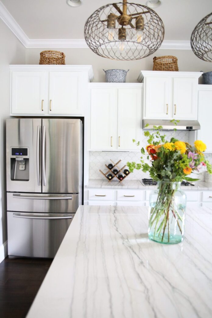 Another example in classic white as always a beautiful choice, and since these cabinets were a bit orange and leaning towards the Tuscany era of early 2000s design {but still in great shape}, our clients opted to paint. Once again, we were happy to bring in a fresh countertop + backsplash! home. Check out the entire tour {it includes their bathroom + study area + dining room, too!} here. Pssst… That backsplash, by the way, is my all-time fave. A sister tile to our own fireplaces in our home a-la Jeffrey Court.