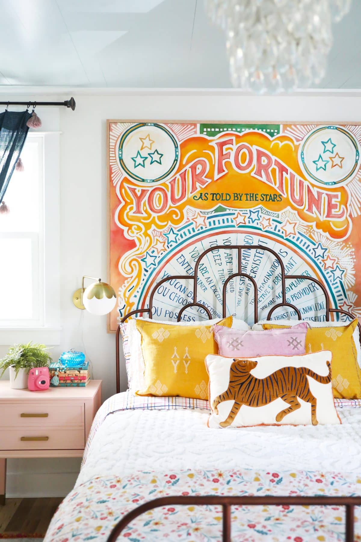 Keeping this fun pattern confined to a headboard space prevented the room from feeling too “busy.” Repeating it in the desk area helped tie the space together. It looks refined and intentional.