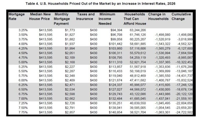 At the beginning of 2026, with the average 30-year fixed mortgage rate at 6.25%, around 31.5 million households could afford a median-priced new home at $413,595. This requires a household income of $124,336 by the front-end underwriting standards. A modest 25 basis-point rate reduction from 6.25% to 6% would lower the qualifying income threshold sufficiently to allow 1.42 million additional households to afford a median-priced new home in 2026.