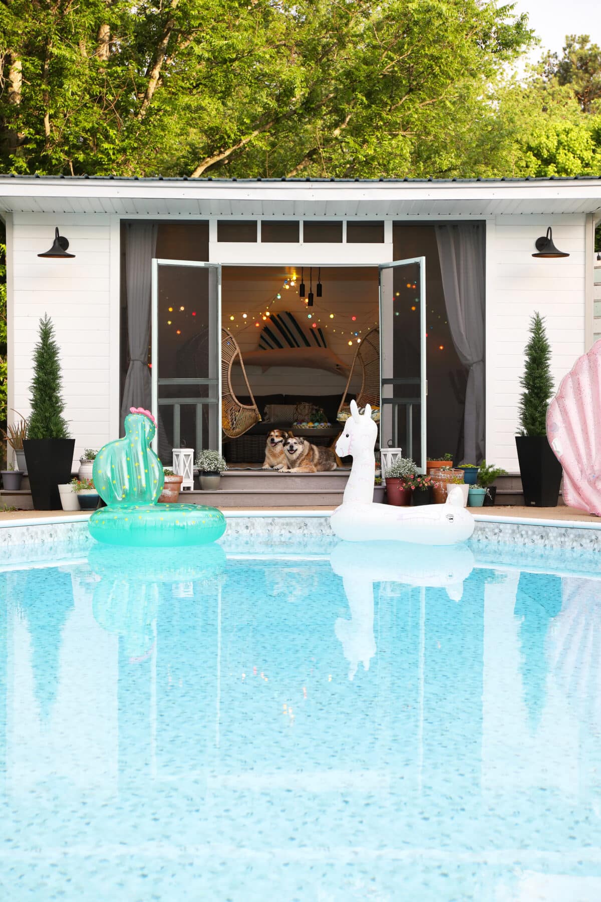 This season, I was sad to take down our colorful Christmas lights. So, I just added them to the cabana, instead. The originals are now sold out, but they have pastel versions here, which are really similar. The kids love hosting game nights in the summer late into the night, and while the photos don’t do them justice, these add the perfect pops of colorful fun while also staying well-lit. {Comboed with these lights + these cords.}