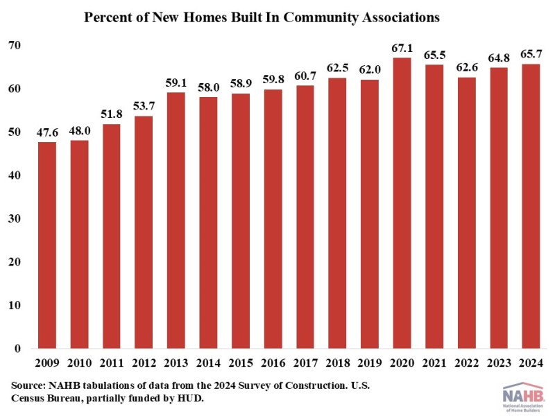 In 2024, 65.7% of all new single-family homes started were built within a community or homeowner’s association. This share increased from the 64.8% recorded in 2023, according to data tabulated from the Census Bureau’s Survey of Construction (SOC). This marks the second highest share since the beginning of the series in 2009, after a high point of 67.1% in 2020. Prior to 2021, the share had been on a decade-long upward trend. In absolute numbers, a total of 651,873 homes were started in community associations in 2024.