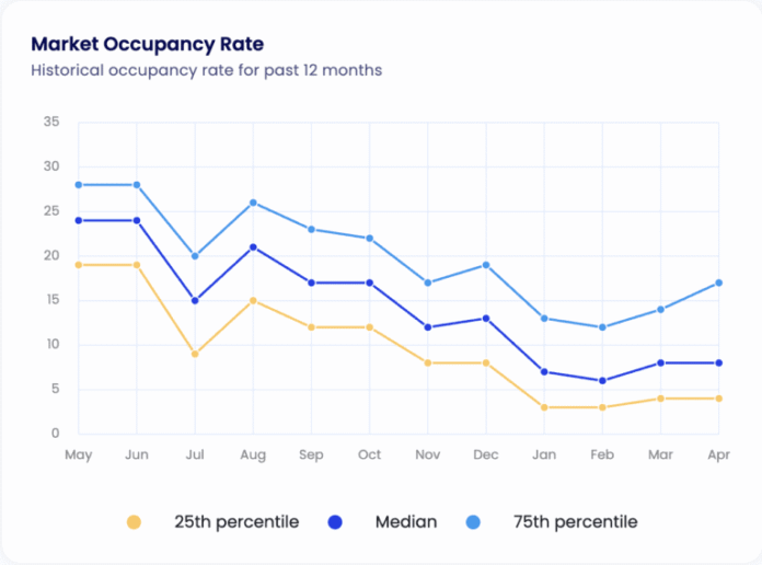 According to Mashvisor’s proprietary data, the average occupancy rate in the US market in the spring of 2025 is around 50%, down from 57% last year. This is due to an influx of new short-term rental listings that have outpaced demand growth, inflation-induced belt-tightening among US travelers, and a lull in international arrivals amid ongoing political uncertainties.