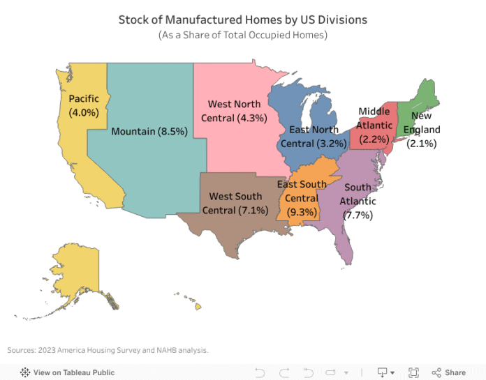 The East South Central division (Alabama, Kentucky, Mississippi and Tennessee) have the highest concentration of manufactured homes, representing 9.3% of total occupied housing. The Mountain region follows with 8.5%, while the South Atlantic region holds 7.7%.