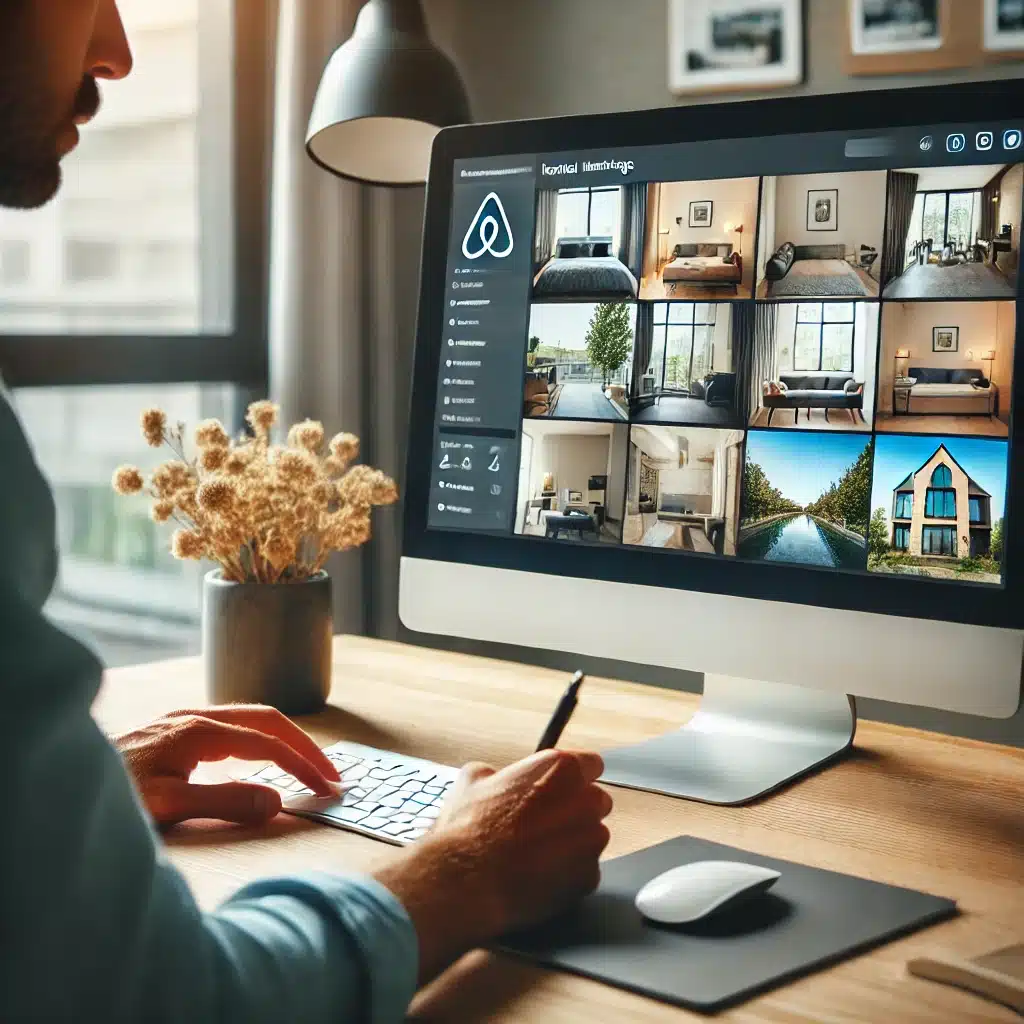 Person working on a computer displaying property images.Person working on a computer displaying property images.
