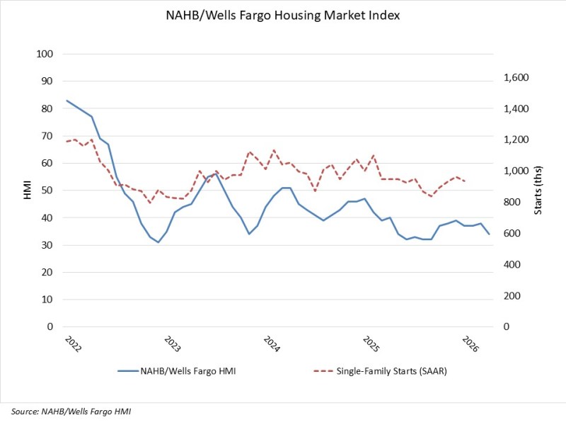 Builder confidence in the market for newly built single-family homes fell four points to 34 in April, according to the National Association of Home Builders (NAHB)/Wells Fargo Housing Market Index (HMI). This is the lowest level since September 2025.