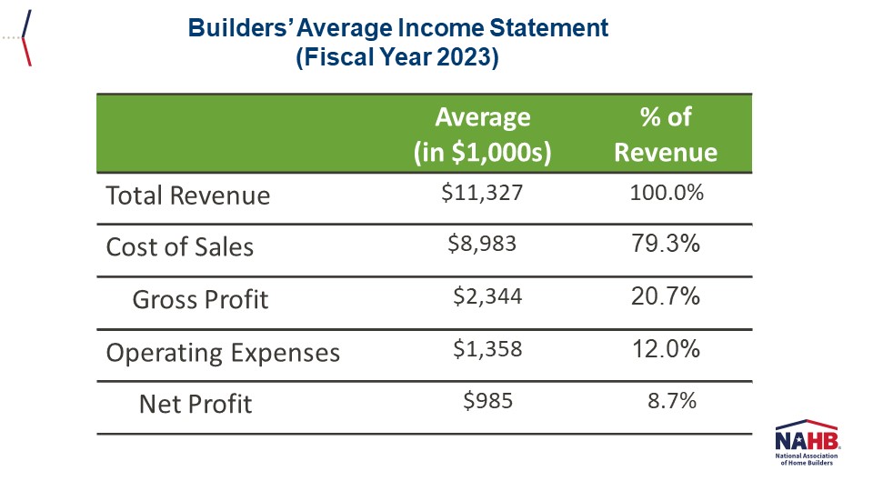 On average, builders reported $11.3 million in total revenue for fiscal year 2023. Of that, about $9.0 million (79.3%) was spent on cost of sales (i.e., land, direct and indirect construction costs), which translates into an average gross profit margin of 20.7%. Operating expenses (i.e., finance, S&M, G&A, and owner’s compensation) cost builders an average of $1.4 million (12.0% of revenue), leaving them with an average net profit margin of 8.7%. This post summarizes the results from NAHB’s most recent edition of the Builders’ Cost of Doing Business Study.