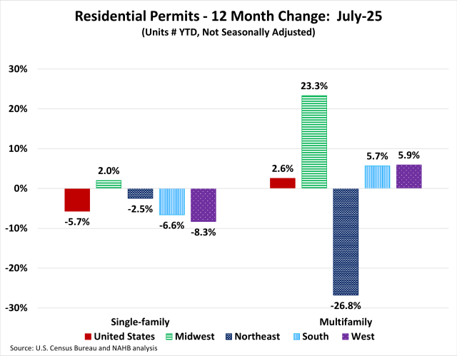 Year-to-date ending in July, single-family permits were up in one out of the four regions. The Midwest posted a small increase of 2.0%. The Northeast was 2.5% lower, the South was down by 6.6%, and the West was down by 8.3% in single-family permits during this time. For multifamily permits, three out of the four regions posted increases. The Midwest was up by 23.3%, the West was up by 5.9%, and the South was up by 5.7%, Meanwhile, the Northeast declined steeply by 26.8%, driven by the New York-Newark-Jersey City, NY-NJ MSA which declined by 38.0%.
