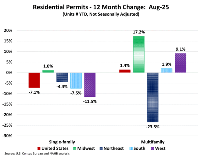 Between August 2025 YTD and August 2024 YTD, 12 states posted an increase in single-family permits. The range of increases spanned 21.2% in Hawaii to 2.5% in Indiana. The remaining 38 states and the District of Columbia reported declines in single-family permits with New Mexico reporting the steepest decline of 35.1%.