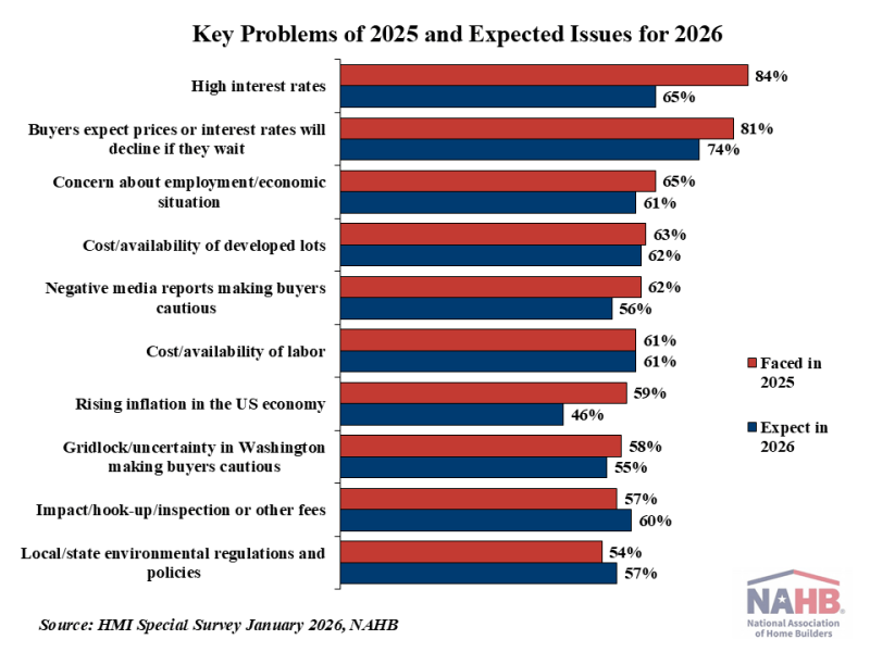 The most significant challenge builders faced in 2025 was high interest rates, as reported by 84% of builders in the latest NAHB/Wells Fargo Housing Market Index survey. A smaller, albeit still significant share of 65% expect interest rates to remain a problem in 2026. The next four most serious issues builders faced in 2025 were buyers expecting prices/interest rates to decline (81%), concern about employment/economic situation (65%), the cost/availability of developed lots (63%), and negative media reports making buyers cautious (62%). Builders expect these challenges to persist with limited improvement in 2026.