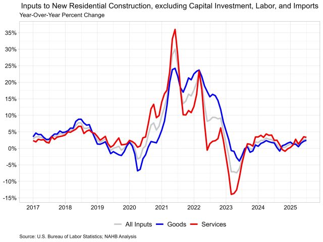The latest available data, for May 2025, showed that domestically produced goods have experienced faster price growth compared to imported goods used in new construction. On a year-over-year basis, the index for domestic goods increased 1.6%, while prices for imported goods rose 0.1% over the same period. Comparatively, service prices have risen more than good prices over the past year, rising 2.7% year-over-year. Across the three indexes, all inputs remain at higher levels compared to pre-pandemic prices.