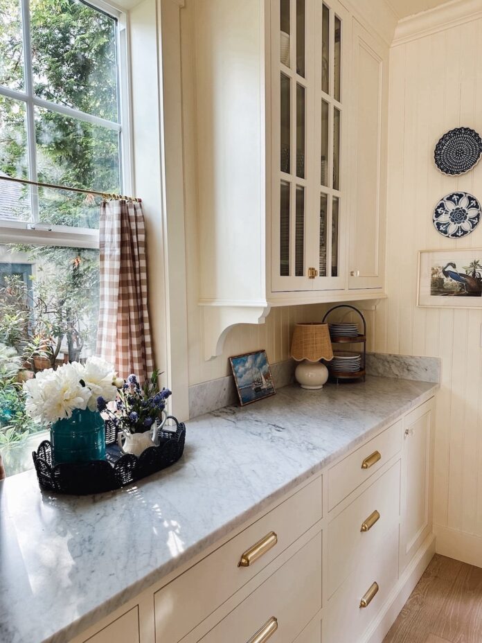 On our island we have a little stool niche which we use a curtain on to add a little softness and pattern. So far I’ve changed the curtain for winter to summer, and will enjoy swapping out different curtains over time just for a fun change. You can see both below.
