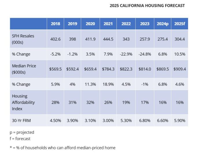 The California‘s housing market forecast for 2025 anticipates a rise in both home sales and prices, with the median home price potentially reaching $909,400. This positive outlook is fueled by a projected improvement in housing supply and a more favorable interest rate environment, attracting more buyers and sellers back to the market.