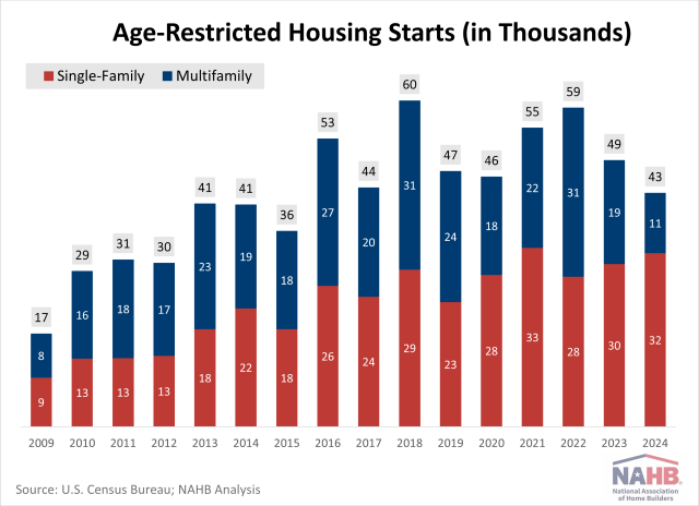 In 2024, approximately 43,000 homes were built in age-restricted communities, representing just over 3% of all housing starts. According to the Census Bureau’s Survey of Construction, roughly three-quarters of these homes (32,000) were single-family units. The remaining 11,000 were multifamily units, which marked the lowest number of age-restricted multifamily starts since 2009.
