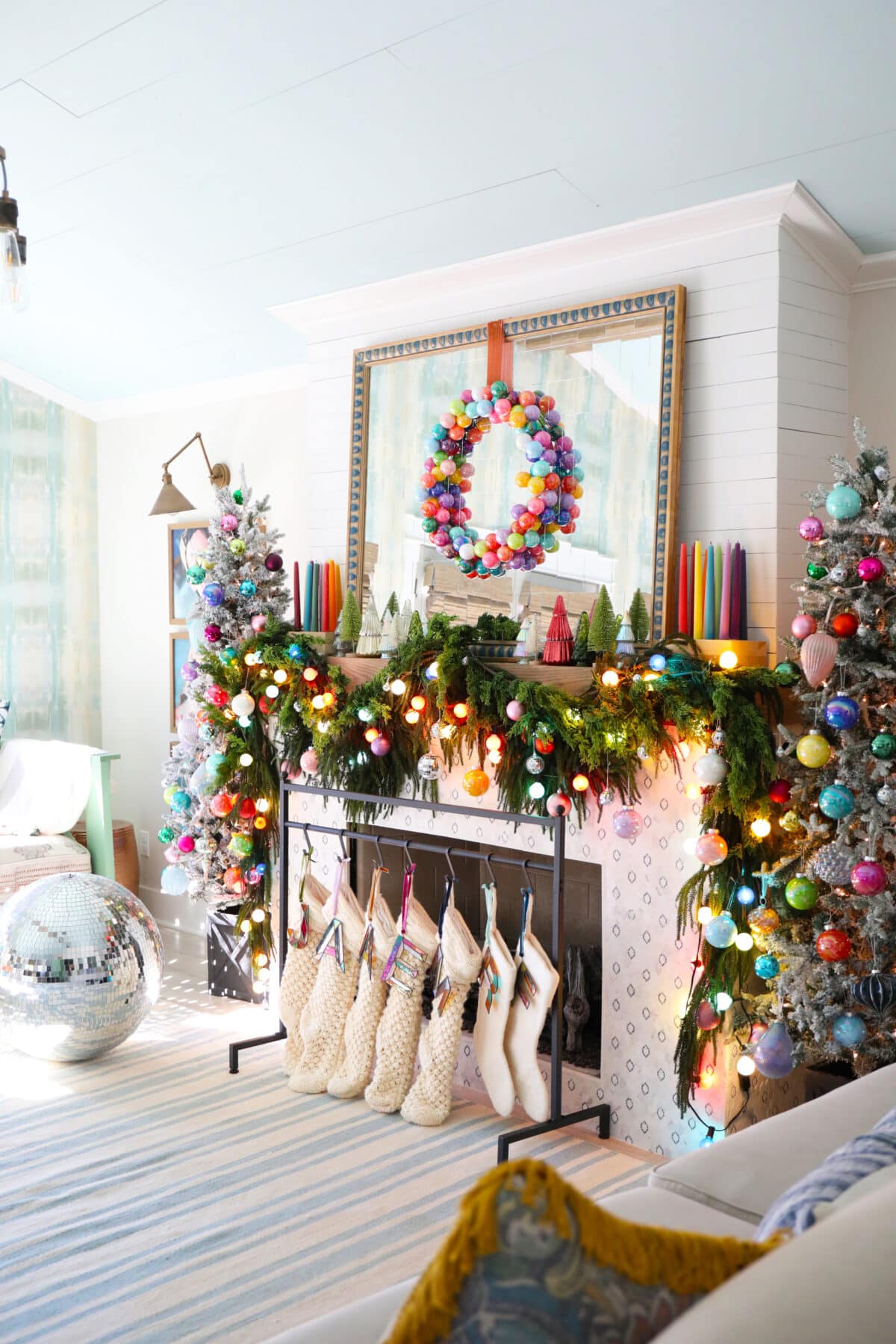 This time around, our larger iridescent baubles and this colorful bauble wreath added quite a bit of color. Today, I’m going to share a simple how-to!