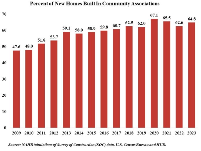 In 2023, 64.8% of all new single-family homes started were built within a community or homeowner’s association. This share increased from the 62.6% recorded in 2022, according to data tabulated from the Census Bureau’s Survey of Construction (SOC). This marks the third highest share since the beginning of the series in 2009, after the high point of 67.1% in 2020 and 65.5% in 2021.  Prior to 2021, the share had been on a decade-long upward trend.  In absolute numbers, a total of 601,558 homes were started in community associations in 2023.