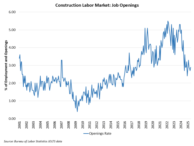 The construction job openings rate ticked up to 2.9% in June, although it is significantly lower year-over-year from 3.4%.