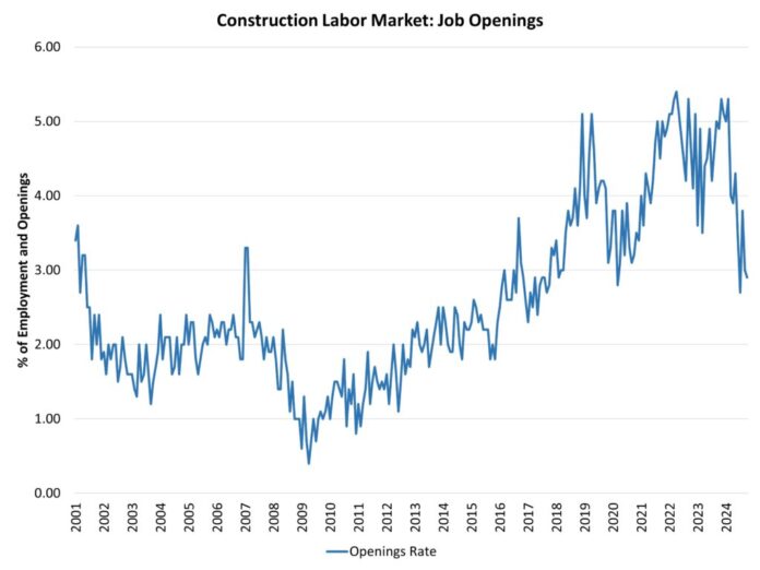 The construction job openings rate fell back to 2.9% in October and continues to trend lower, albeit with a fair amount of statistical month-to-month noise in the recent data.