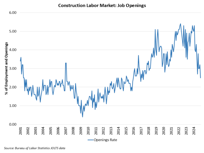 The construction job openings rate moved lower to 2.5% in December, significantly down year-over-year from 5.1%. This is the lowest open rate for the construction sector since 2017.