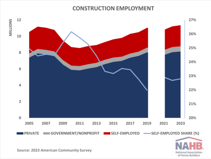 As of 2023, close to 2.6 million of workers employed in construction are self-employed, according to the latest American Community Survey (ACS). While the industry’s payroll employment surpassed the historic highs of the home building boom of the mid-2000s, the number of self-employed remains below the peak of 2006 when over a quarter of the construction labor force was self-employed.