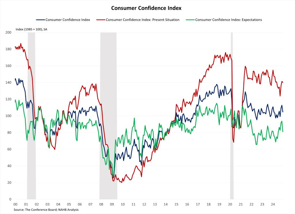 Consumer confidence fell to a three-month low in December amid growing concerns about economic uncertainties, especially potential tariffs. These policy changes could derail inflation progress and lead the Fed to slow its easing pace.
