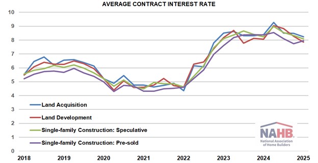 The cost of credit for residential Land Acquisition, Development & Construction (AD&C) eased in the first quarter of 2025, according to NAHB’s survey on AD&C Financing. During the quarter, the average contract interest rate declined on three of the four categories of loans tracked in the NAHB survey: from 8.48% in 2024 Q4 to 8.23% on loans for land acquisition, from 8.28% to 7.86% on loans for land development, and from 8.34% to 8.08% on loans for speculative single-family construction. The average rate on loans for pre-sold single-family construction meanwhile bucked the trend, increasing from 7.75% to 7.96%.
