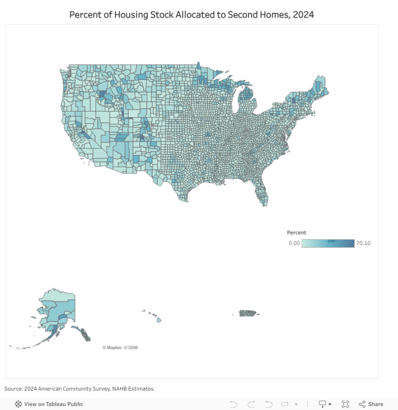 In 2024, the number of second homes in the U.S. was 6.2 million, accounting for 4.3% of the nation’s housing stock, according to NAHB estimates. This reflects a modest decline from 2022, when the number reached 6.5 million. This decline suggests some cooling following the pandemic-era surge in second home demand.