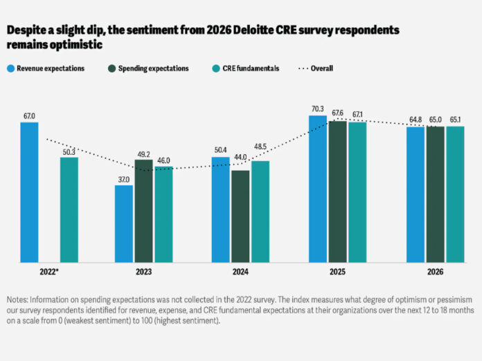Deloitte’s 2026 commercial real estate outlook cites global macroeconomic volatility and policy uncertainty for dimming commercial real estate executives’ optimism for the industry slightly compared to last year but notes the recovery is only pausing, not stopping.