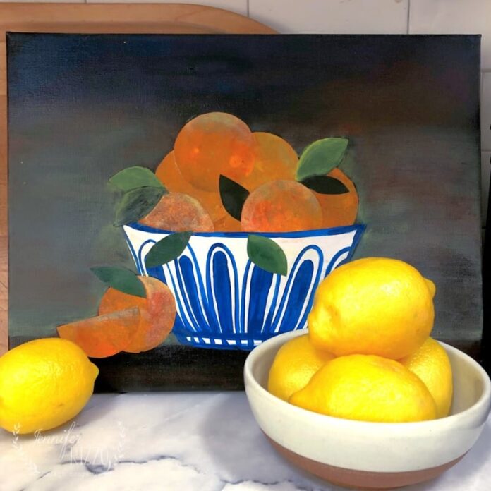 Summer is here, and I am so happy! It’s finally warm enough to sit outside, and bring in flowers from the yard like lilacs! It’s a good time to make small decor changes. Am I the only one who likes to add new art to their walls with each season? I wanted to add a new piece of art above my sub-level stairway. I always feel like it’s an area I look at everyday, and a beautiful piece of art should be hanging there. I loved the idea of a still life painting of a bowl of oranges. Oranges seem so fun for summer, don’t they? I decided to try and use an mixed media art technique to make cut paper still life art. I loved doing this project, because it gave me the chance to play with paint, paper, and decoupage medium. I really love decoupaging. I used to decoupage furniture, glass and fabric and haven’t done it in a while. The one thing I did forget was how decoupage glue seems to stick to your fingers, and you’re peeling it off hours later. This is a fun project and you really can play with paint and paper. The full tutorial and templates are below.