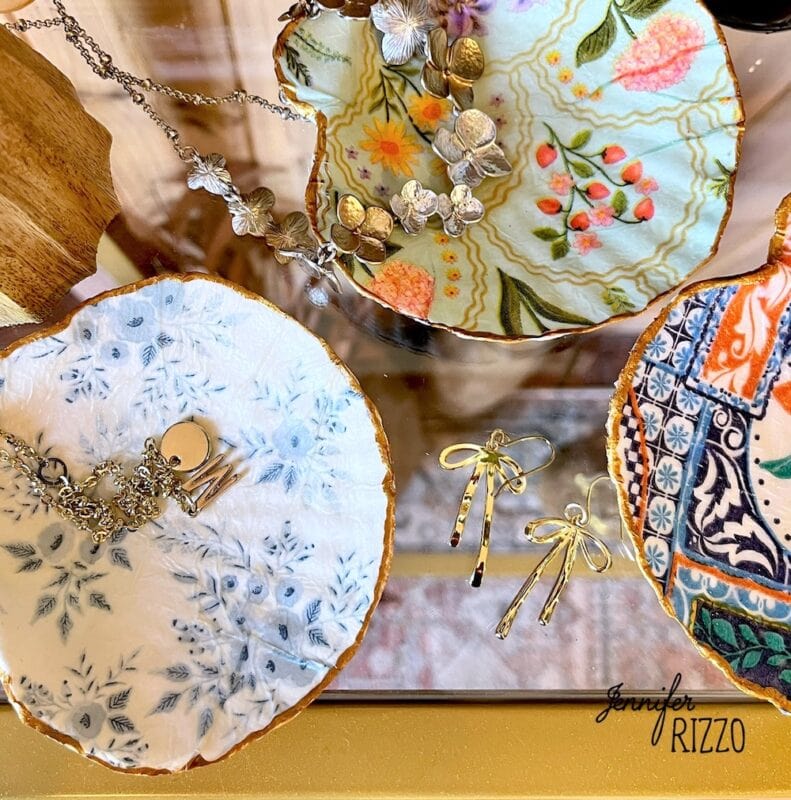 Three decorative ceramic dishes with floral and geometric patterns display jewelry including a necklace, a bracelet, and a pair of bow-shaped earrings. The name "Jennifer Rizzo" is visible.
