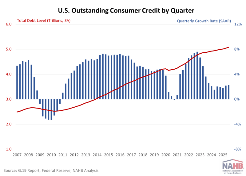 Overall consumer credit continued to rise for the third quarter of 2025, but the pace of growth remains slow. Student loan balances continue to rise as well, slowly returning to pre-COVID growth. Furthermore, credit card and auto loan balances continue to grow but at historically low rates. Although interest rates are still elevated, credit card and auto loan rates continue to decrease slightly.