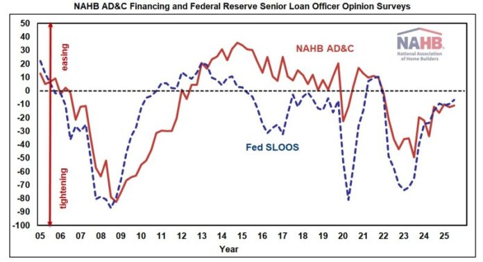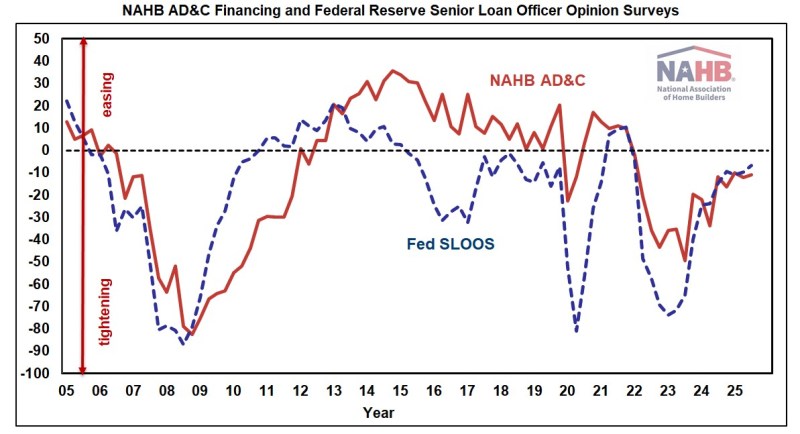 Credit conditions on loans for residential Land Acquisition, Development & Construction (AD&C) were still tightening in the third quarter of 2025, according to NAHB’s quarterly survey on AD&C Financing. The net easing index derived from the survey posted a reading of -11.0 (the negative number indicating that credit tightened since the previous quarter). This is in reasonably close agreement with the third quarter reading of -6.6 for the similar net easing index produced from the Federal Reserve’s survey of senior loan officers—marking fifteen consecutive quarters of tightening credit conditions reported by both builders and lenders.