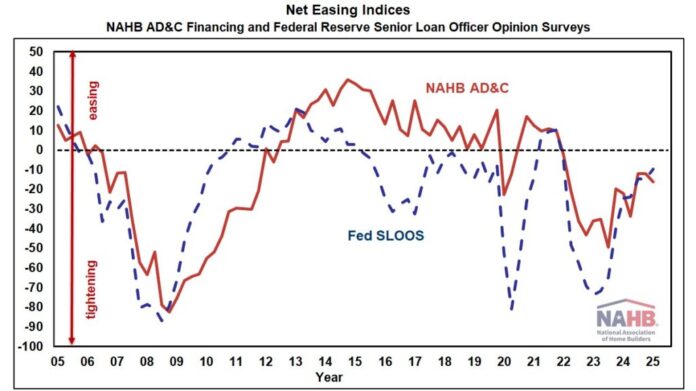 Borrowers and lenders agreed that credit for residential Land Acquisition, Development & Construction (AD&C) tightened further in the fourth quarter of 2024, according to NAHB’s survey on AD&C Financing and the Federal Reserve’s survey of senior loan officers. The net easing index derived from the NAHB survey posted a reading of -16.3, while the similar index derived from the Fed survey posted a reading of -9.5 (the negative numbers indicating that credit tightened since the previous quarter). Although the additional net tightening in the fourth quarter was modest (as indicated by negative numbers much closer to 0 than -100), this marks the twelfth consecutive quarter during which both surveys reported net tightening of credit for AD&C.