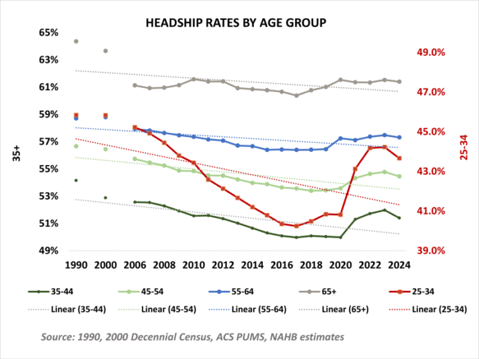 In addition to cyclical economic constraints, including housing shortages, affordability pressures, labor market conditions, and credit tightening, long-term demographic and social trends can influence headship rates. While cyclical factors cause temporary fluctuations, fundamental structural changes, such as delaying marriage and childbearing, rising student debt, and greater acceptance of shared living arrangements, may have lasting effects, permanently lowering equilibrium headship rates. NAHB’s analysis of historical Decennial Censuses and ACS data shows that headship rates have decreased across all adult age groups over the past several decades. Adults ages 25 to 34 experienced some of the largest declines since the 1990s and early 2000s. If these long-term trends represent permanent shifts in life-cycle timing and living preferences, then the headship rates from the 1990s and early 2000s may no longer serve as accurate long-term benchmarks for forecasting or policy. In fact, the long-term average, commonly used as a proxy for normal or equilibrium rates, is now several percentage points below the headship rates of the early 2000s for all age groups.