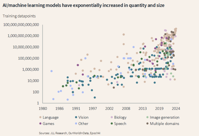 AI demand will mean more than just accelerated power demand, but also a push for further miniaturization in data center design. JLL anticipates that advances in chips will eventually reach 250 kW per rack, an amount the report calls “astounding.”