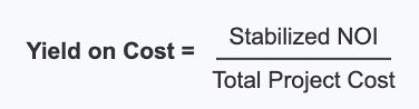 Yield on Cost (sometimes called return on cost) is especially useful in development and value-add scenarios. It tells you what your expected return will be based on the cost to acquire, develop, or improve a property, rather than basing it on its market value.