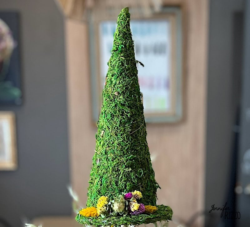 Halloween decor doesn’t have to be spooky or gorey. In fact, it can be very soft and pretty! I love anything covered in moss and dried flowers! Creating this DIY moss witch’s hat with dried flowers and turning it into a topiary was something that I knew would combine all of those things and would be a very pretty and enchanting Halloween decoration! You can create just the witch hat or you can take it a step further and turn it into the witch hat topiary like I did. The Topiary creation will be in a separate post. How big you make your witch hat depends on your cones. This hat is for a 6 inch tall cone and a 6 inch cardboard cake round This is so much more fun and pretty than a plain black witch hat!