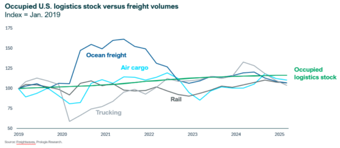 Prologis data shows that even as freight volumes gyrate—especially ocean freight, which expanded quickly in the early part of the pandemic and then slowed down—occupied logistics stock has seen a steady uptick.