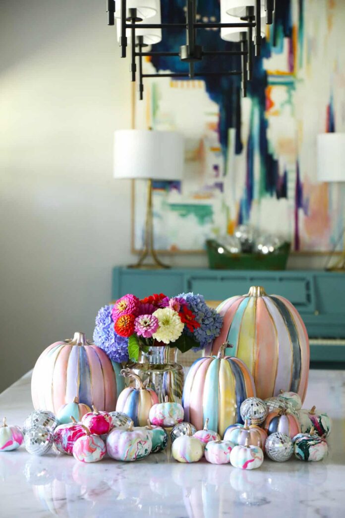 Next up: These simple marbelized pumpkins. This has been around forever, and we wanted to try our hand at our own.