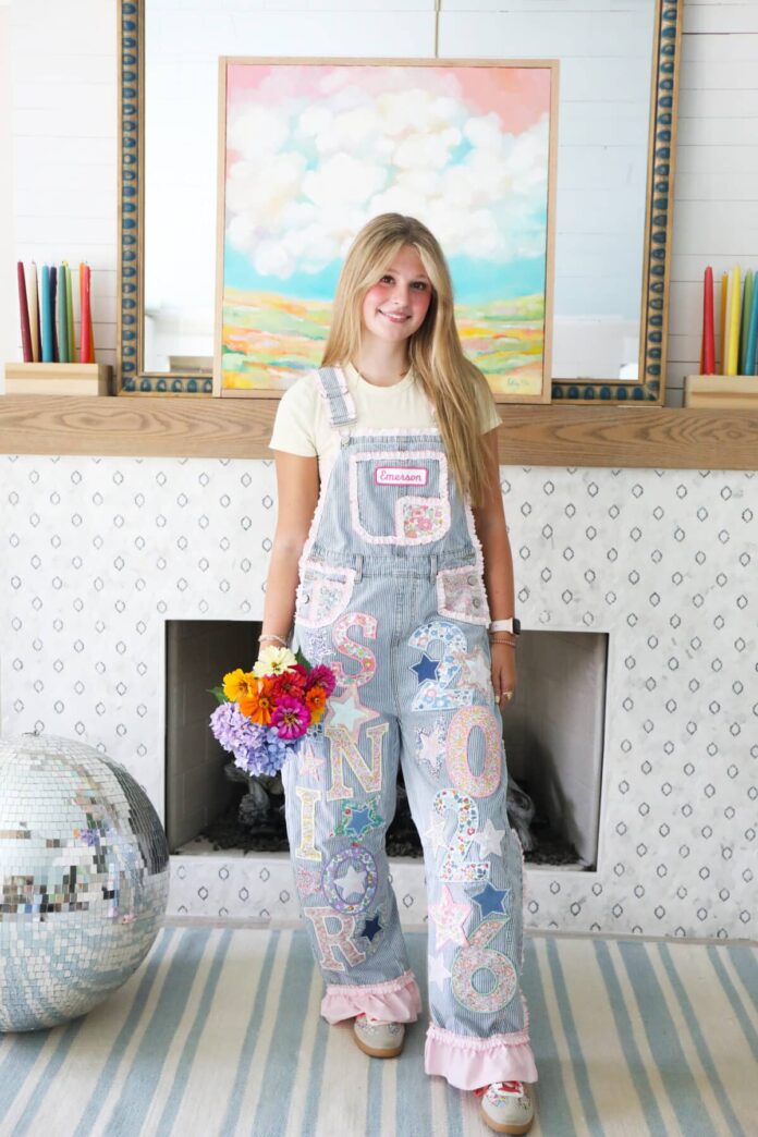 Growing up in my neck of the woods, senior overalls were not a thing. Now that our second-born has started her senior year, it apparently is a thing here. It originated in Texas, and somehow made its way here {Nashville} with all things traditions. Our oldest is a boy, and he did not {understandably} care to participate in crowns, little kid backpacks, and overalls. So these sweet little traditions are a little new on our radar, even though this isn’t our first rodeo. Emerson knew it was coming up, so we started planning over the summer. I wasn’t even sure I could handle this project, as seamstress, I am not. But I’m here to tell you that if I can do them, anyone can. I may not be able to feel my fingertips anymore, but we did it… high fives all around. Today, we’re sharing a few easy tips for senior overalls.