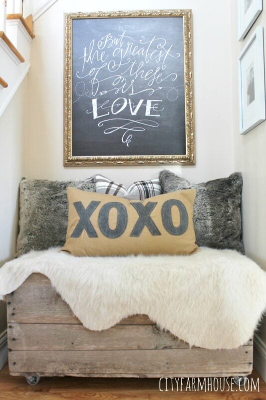 Cozy seating area with a rustic wooden bench, plush fur throw, and an assortment of pillows, including an easy XOXO felt letter pillow. A framed chalkboard above adds decor.