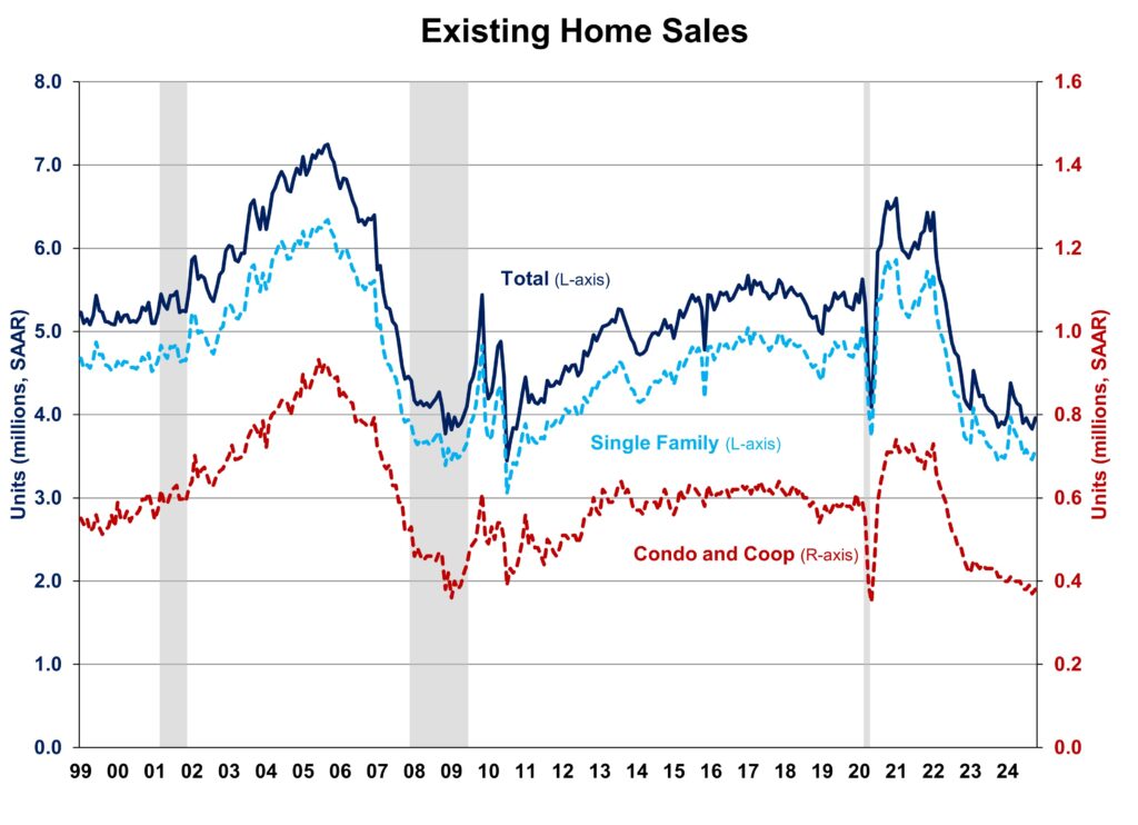 Homeowners with lower mortgage rates have opted to stay put, avoiding trading existing mortgages for new ones with higher rates. This trend is driving home prices higher and holding back inventory. With the Federal Reserve beginning its easing cycle at the September meeting, mortgage rates are expected to gradually decrease, leading to increased demand and unlocking lock-in inventory in the coming quarters. Total existing home sales, including single-family homes, townhomes, condominiums, and co-ops, rose 3.4% to a seasonally adjusted annual rate of 3.96 million in October. On a year-over-year basis, sales were 2.9% higher than a year ago, ending a 38-month streak of year-over-year declines since July 2021.