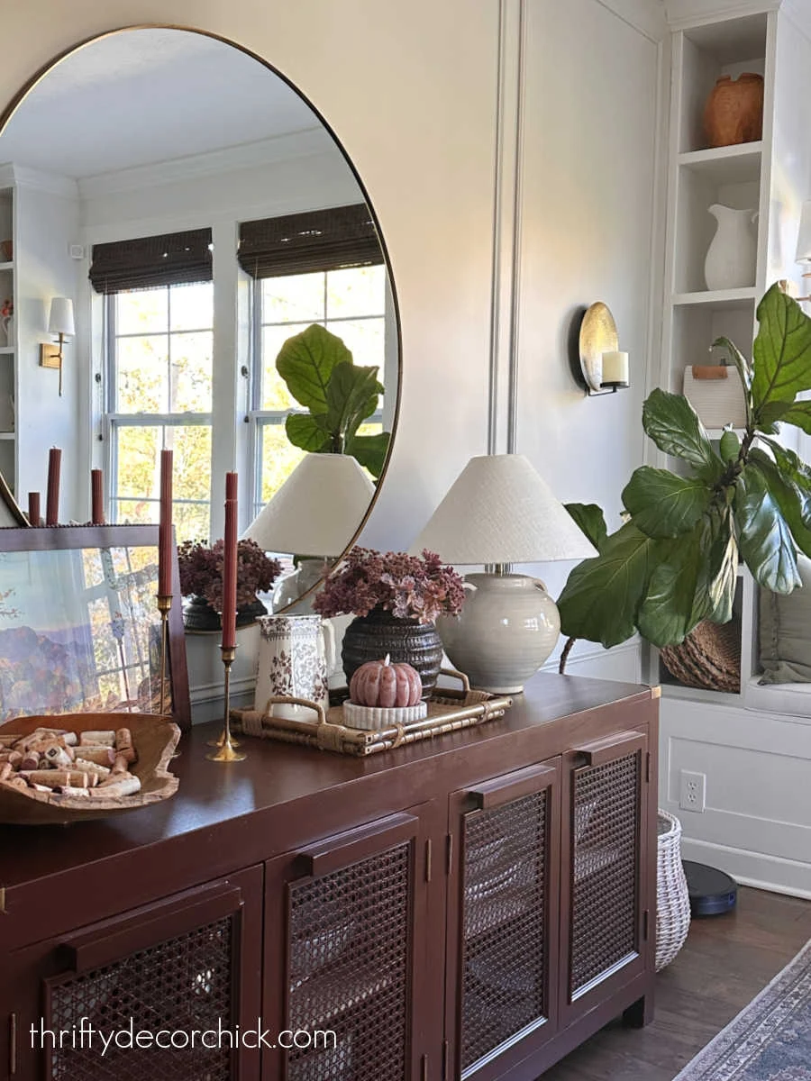 This buffet was a little farmhouse-ish looking until I painted it this rich burgundy color. It fits into this room so much better, and the added trim and small details give it a more elevated look: