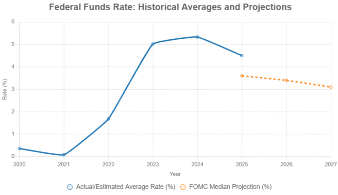 To put these predictions into context, let’s visualize it. To contextualize, the following chart traces annual average federal funds rates from 2020 onward, blending historical data with FOMC median projections. Note the sharp 2022-2023 ascent and anticipated glide path. We can see the dramatic rise in rates to combat inflation, followed by the expected gradual decline.