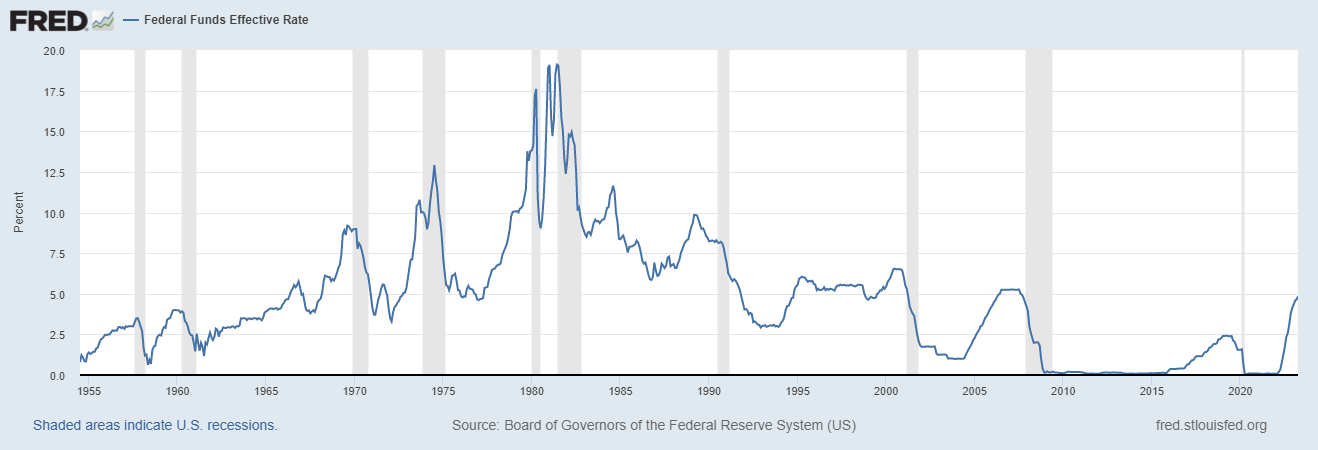 The below Federal Reserve Interest Rates Chart provides a visual representation of the Federal Funds Effective Rate from July 1954 (0.80%) to December 2023 (5.33%).