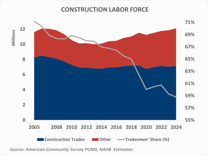 As of 2024, the construction labor force exceeds 12.1 million workers, slightly above its mid-2000s peak. Construction trades, such as carpenters, electricians, painters, plumbers, laborers, and first-line supervisors, account for 7.1 million workers, or 58.8% of the total. By comparison, there were 8.5 million trade workers at the peak of 2006. The loss of more than one million tradesmen helps explain the persistent labor shortages reported in the NAHB/Wells Fargo Housing Market Index (HMI) Survey.