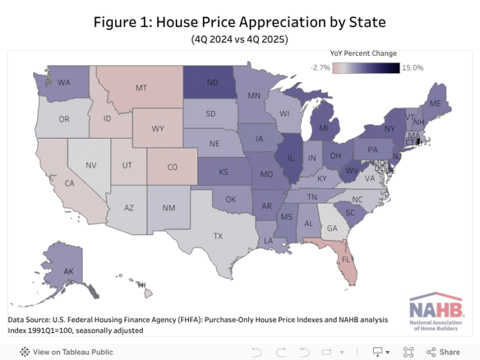 At the state level, 43 states experienced positive YoY price growth between the fourth quarter of 2024 and the fourth quarter of 2025, with gains ranging from 0.1% to 6.4%. North Dakota led the nation with a 6.4% gain, followed by Delaware with a 6.3% gain and Illinois with a 6.1% gain. On the opposite end, nine states and the District of Columbia reported negative YoY house price appreciation. Florida posted the most significant price decline at 2.7%. Notably, 33 states exceeded or matched the national YoY growth rate of 1.8%. On a quarterly basis, home prices declined in five states compared to the third quarter of 2025, highlighting softening momentum in select regional markets.