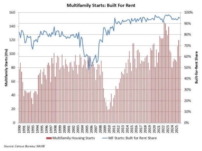 According to NAHB analysis of quarterly Census data, the count of multifamily, for-rent housing starts increased year-over-year during the fourth quarter of 2025. For the quarter, 96,000 multifamily residences started construction. Of this total, 91,000 were built-for-rent. This built-for-rent total was 18% higher than in the fourth quarter of 2024. This marks a significant increase, and it is possible these numbers will be revised lower in future Census data given other multifamily data reporting.